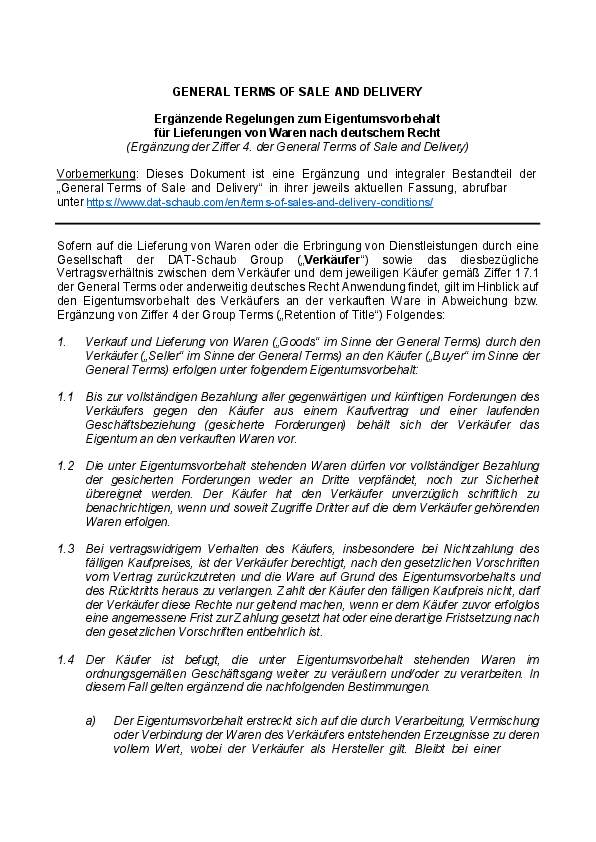 Terms of Sales and Delivery Conditions DAT Schaub Group Terms Of Sale And Delivery0.18 MBDownloadEigentumsvorbehalt (German customers only) Eigentumsvorbehalt DAT Schaub PDF0.1 MBDownload