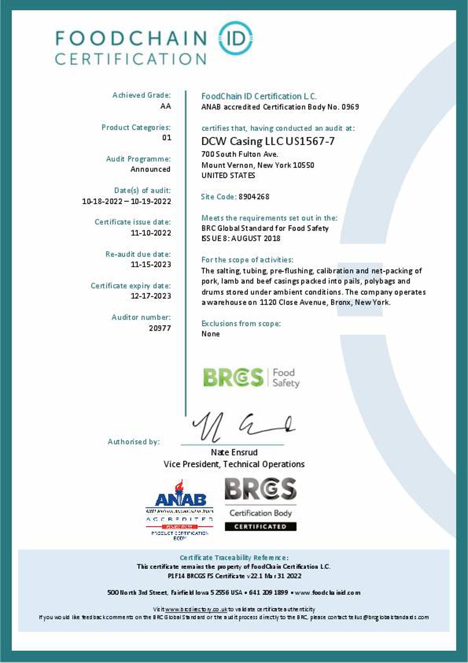 DCW Casing, LLC. is a proud recipient of our BRC Certification as of November, 2014. As the leading United States manufacturer in the sausage casing business, DCW believes we also have a commitment to be a leader in food safety within our industry.