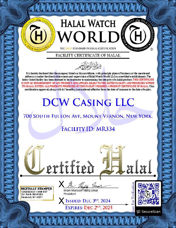 Our facility is certified for the production, handling and storage of Halal Lamb and Sheep Casings. We adhere strictly to Islamic practices, with full traceability and regular testing in place to ensure compliance. To receive a halal certified product with your order, make sure to include a request at the time of ordering.